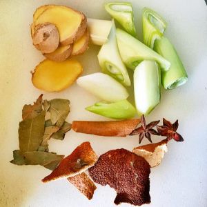 放入大料、香叶、桂皮, 姜片、葱段、拍过的蒜