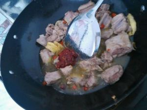 在把油倒入锅中烧热,待油热后,加入豆瓣酱(如果是郫县豆瓣酱的话味道会更好)煸香再加入排骨一起炒制.