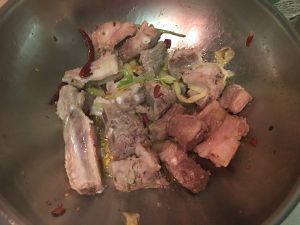 step1.市场买好的排骨洗干净,煮上一锅水,放两三片姜片,料酒,凉水放排骨,大火五分钟去血沫,这样处理的肉会干净去腥。5min后,用凉水把排骨洗干净。