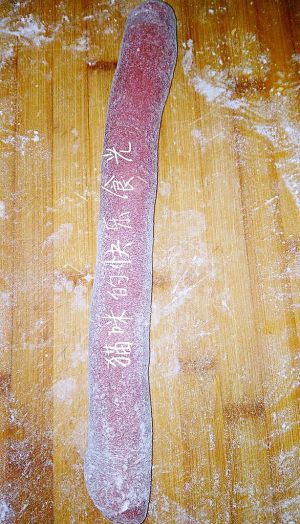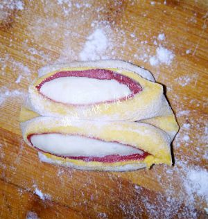 取红色面团,用擀面棒擀开,包裹住白色面团。