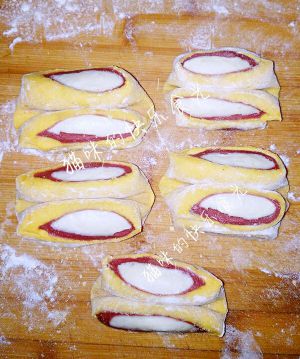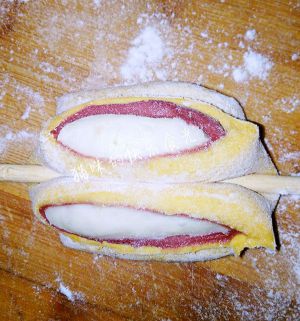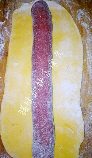 把黄色面团,用擀面棒擀开,包裹住红色面团。