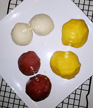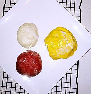 揉面排气,尽量多揉哈,把空气排干净,这样做出来的馒头才会有劲道哦。 排气后将白色面团分成70%和30%的两份,70%的一份加入红曲粉揉均匀、30%的一份保留原色。