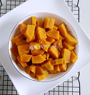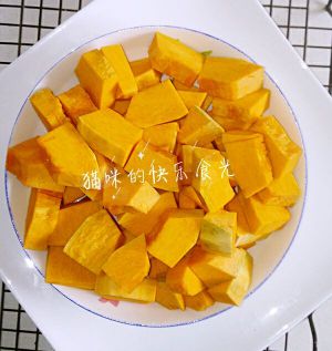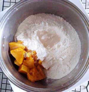 取200克南瓜,加入250克面粉、3克酵母(南瓜泥水分很大,所以不需要额外加水)。