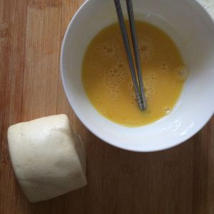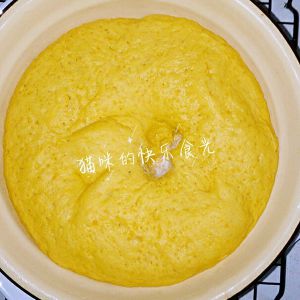 将南瓜面团和白色面团一起放温暖的地方发酵。 (目测面团发酵后的体积至原来体积的2倍大小即可。用手指沾些面粉插进去,如果出现不立即回弹的凹洞就表明面团发酵完成了。)
