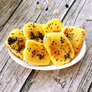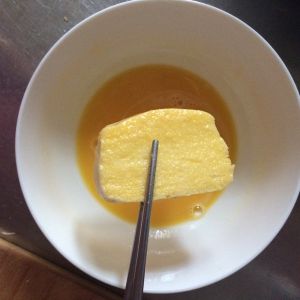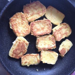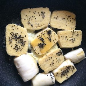 裹好蛋液的馒头片放入平底锅,表面撒上黑芝麻