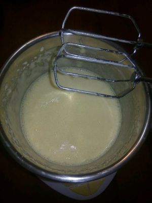 鸡蛋加糖用打蛋器打至体积膨大,颜色泛白。