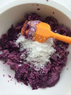 紫薯蒸熟放白糖,拌匀