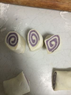 发酵好的白色面团,紫薯面团分别排气,整形。擀成薄片,刷油,白色在下,紫色在上。卷起。