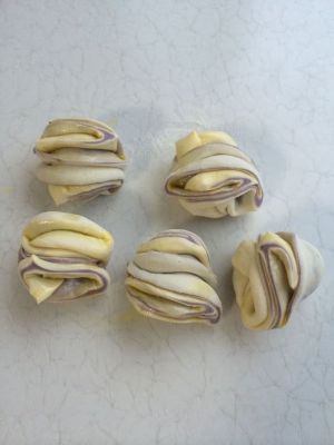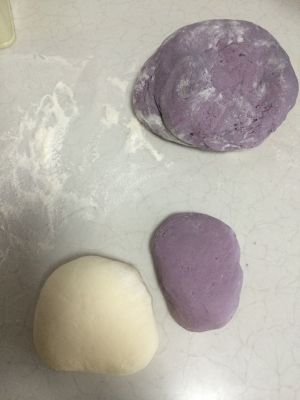 1.A材料+100克温水,25克白糖,活成白色面团。 2.B材料+100克紫薯泥,25克糖,80克温水酌情加入,活成紫薯面团。