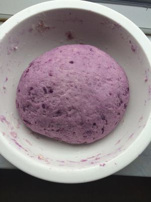 面粉里放酵母,将紫薯与面粉揉成面团,发面