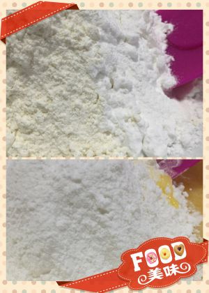 土豆淀粉、低筋粉及泡打粉混合并用刮刀搅拌均匀,然后过筛倒入3中。