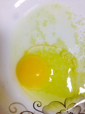 鸡蛋打散。加入玉米油搅拌均匀。