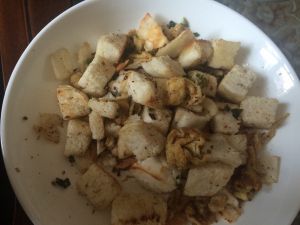 锅内加油,油热了倒进葱花,翻炒,有葱香味后加入馒头块翻炒。