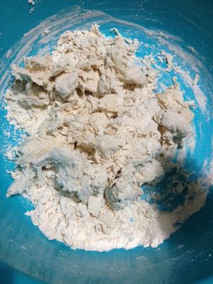 到入化开的酵母水 边倒边将面粉揉成只有少许干粉的棉絮状
