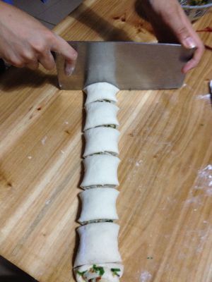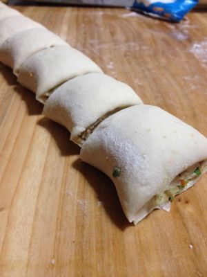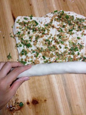 揉好的面团放案板上用擀面杖 擀成长方形状 均匀的撒上葱花末