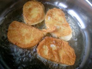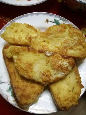 锅中加适量油烧热,馒头片放在鸡蛋液里沾一圈放在锅里煎,一面金黄后翻到下一面煎到金黄就可以了