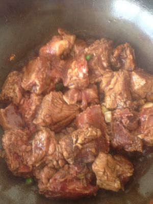 锅内加油烧开后加入葱段爆香加入酱油再加入排骨翻炒