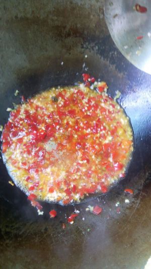 调剁椒汁,因为买回来的剁椒水份太多了,锅里放油烧热,下入姜蒜茸辣椒炒香放点十三香。