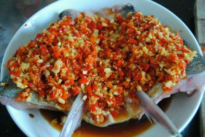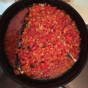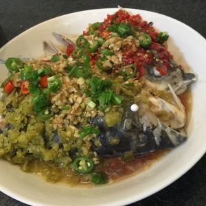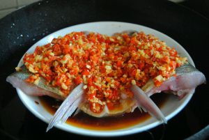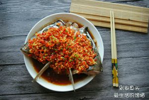 将炒好的剁椒均匀的覆盖到鱼头上,上锅继续蒸15分钟。