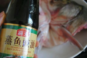 往鱼头上均匀淋上料酒后,再均匀淋上蒸鱼豉油