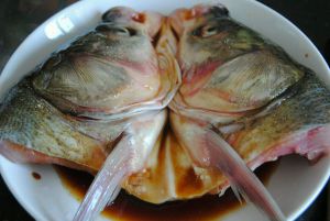 将鱼头从中间切开,但不要切断,加料酒,香葱,姜,鱼头抹盐腌制15分钟。