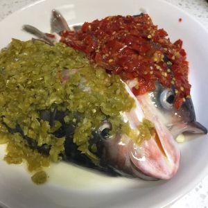 洗净的鱼头在边缘厚肉处擦上少许细盐,底下放上几片姜、蒜瓣、葱,抹一些料酒(我用了五粮液,感觉用白酒比用料酒的肉更鲜甜),将红绿剁椒均匀铺在鱼头正面,腌制30分钟。 放到锅里大火蒸上10-15分钟(看鱼头大小而定,基本上鱼眼睛爆出就已经熟了),出锅后将盘子里的腥水倒掉。