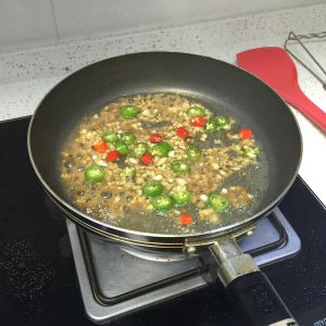 炒剁椒,锅内放油,先倒入蒜末小火炒香,加剁椒,郫县豆瓣酱,酱油适量,鸡粉,盐炒至剁椒出汁后出锅备用。