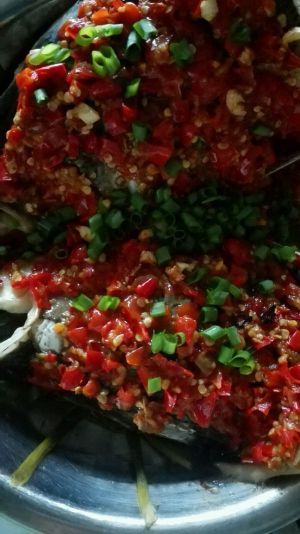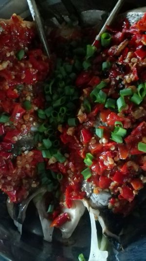 盘内铺上葱姜段,放入腌好的鱼头上锅大火蒸10分钟,关火把盘子中的水倒出,把调制好的剁椒铺匀鱼头上,再上火蒸15分钟取出,洒上葱花。