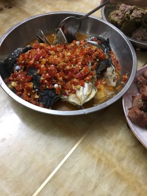 炸鱼的油可以继续用,锅里放多一点油,(没有拍照)下姜蒜末爆香放入3勺剁椒酱放适量的盐,(我们家弄盐的就是那种专门弄调料的勺子,半勺盐)炒均匀以后放在鱼头的上面,