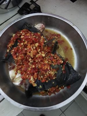 将蒜茸和葱碎铺在鱼头上,再蒸一分钟。