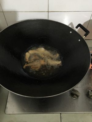 锅里放油烧热下鱼块,放入几块鱼块,炸的时候不要翻动鱼块(油不要放太多,太多油会浪费,)鱼块变成黄色用筷子翻动,跟图片上的颜色就可以翻动鱼块,你想炸干一点就炸久一点捞起就行。
