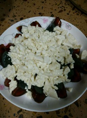 榨菜,皮蛋切丁,小葱切葱花,洒在豆腐上面。