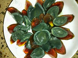 皮蛋去壳,用线分成小块,铺在豆腐盘里;