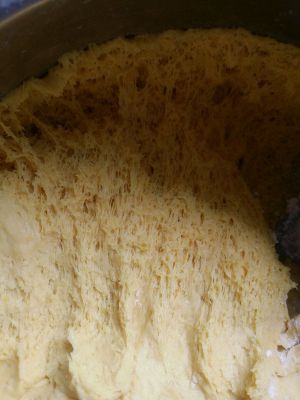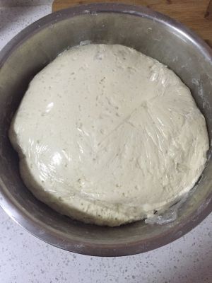 待温热加入酵母混合搅匀,加入盐和面粉搅拌,直到不沾手,揉光滑即可,盖上盖子夏天大概发酵40分钟。天冷可以用温水隔着盆发酵。