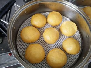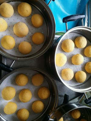 蒸30半小时,馒头用勺子按上去,不留印子即熟透。蒸好后5分钟后开盖,避免回缩。