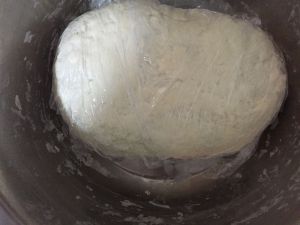 再加入温水揉成面团。用保鲜膜盖好,我们家是地暖,我就放在地上,上面盖一个盖子或者湿布子,防止面变干!