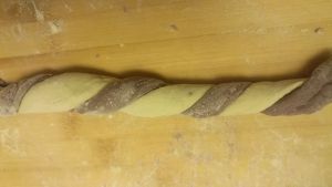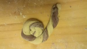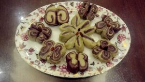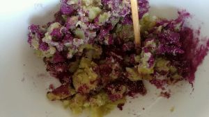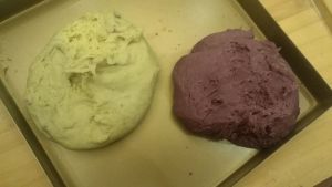 取一半掺入紫薯粉搅拌,再加入白面、酵母合成团。