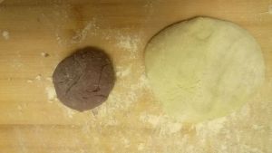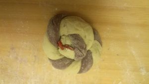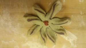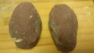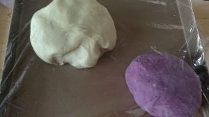 取一小团紫薯面,一小团白面,白面擀成片,把紫薯面包里。