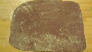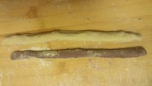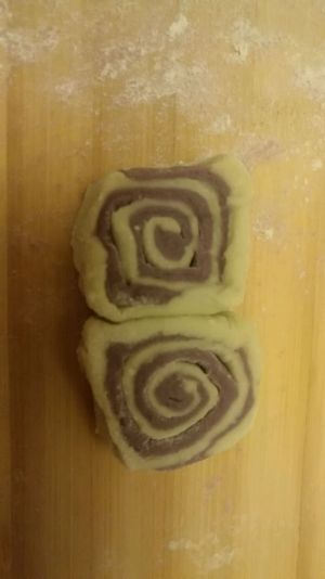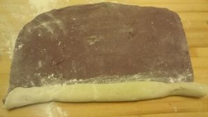 白面和紫薯面分别擀成片,落起来,用刀修正边缘。