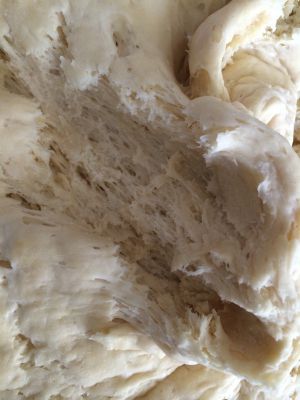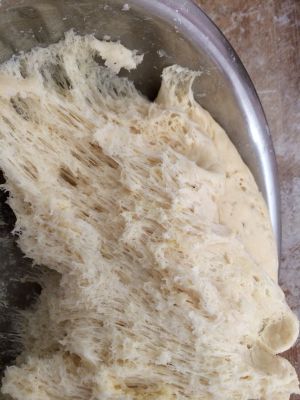 台面放约30g干面粉,将发酵好的面团放在台面进行呛面,将干粉全揣进去,至面团光滑状态,切面无大的气孔状态