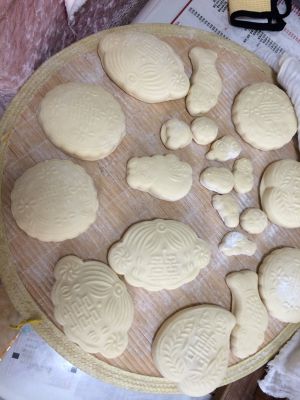 案板上撒点干粉,拿出一份用手轻轻按压成长形。