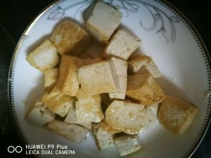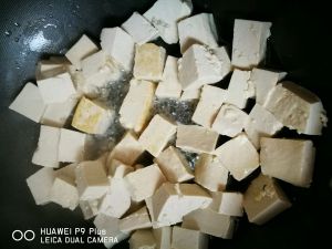 将豆腐放入油中稍微煎一下,以免炒的过程中豆腐散了。