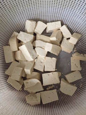准备馅,嫩豆腐一块切成小块放开水里烫两到三分钟。