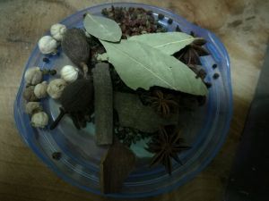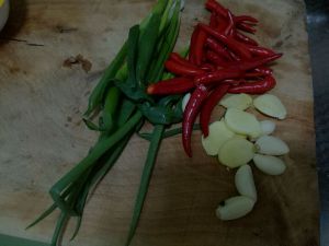 葱、姜、蒜、辣椒切段不用切太小,家里就这一种干辣椒凑合着用吧,(不过这辣椒确实够辣)花椒(家里没麻椒了只能光用花椒了)香叶 八角 桂皮 小茴香放一起备用。