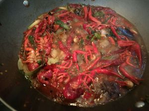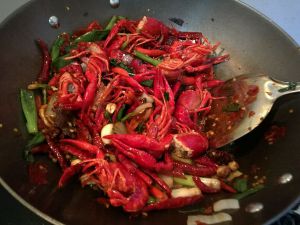 之后下干料,炒香,把调料拨到一边,加郫县豆瓣酱,炒香后放小龙虾,多翻炒一会。