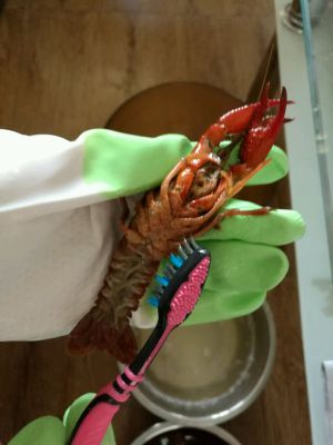 小龙虾用盐水浸泡半小时,用牙刷洗净
