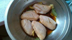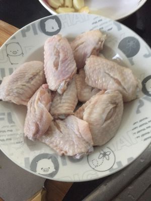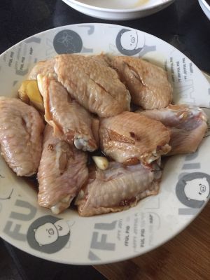 将洗净的鸡翅,用酱油,料酒,葱姜,盐等调料腌制上。