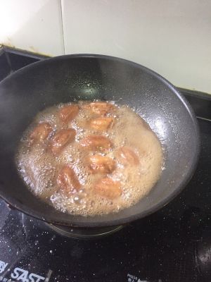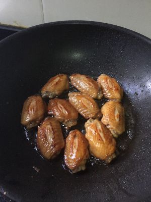 油烧热,放砂糖或冰糖都可以,给鸡翅上糖色,再加入葱姜香料翻炒。