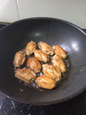 将腌好的鸡翅开始炒了。将锅中放上少许油,然后将鸡翅放入。