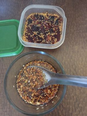泼油之后晾凉储存,让香料的味道充分融入,我多晾一段时间,将里面杂质挑除,再用空罐存储供后续使用。罐子记得开水消下毒